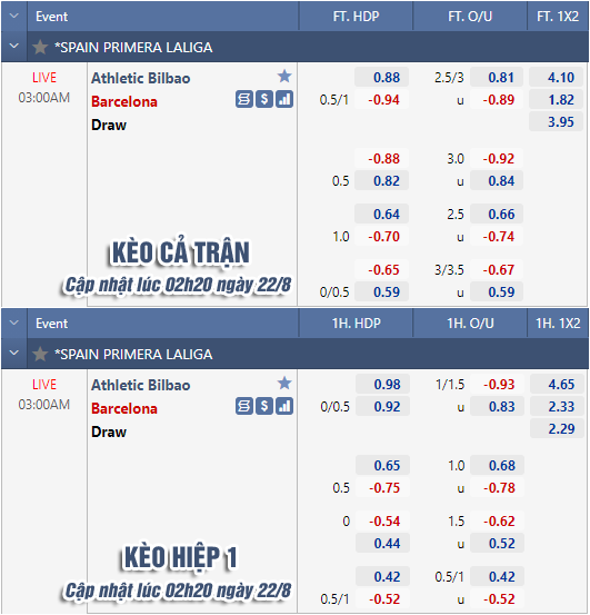 * Chốt kèo trận Bilbao vs Barcelona (03h00 ngày 22/8)