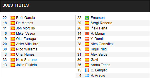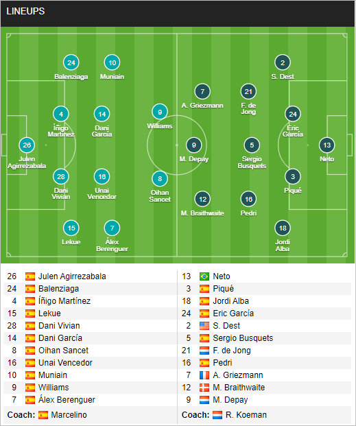 Đã không có thay đổi nào trong đội hình ra sân của Barcelona ở trận này, có vẻ như HLV Ronan Koeman đã tìm ra đội hình tối ưu nhất trong điều kiện thực tại của đội bóng xứ Catalan. Trong khi phía bên kia chiến tuyến, Bilbao cũng chỉ có 1 sự thay đổi ở vị trí hậu vệ phải.