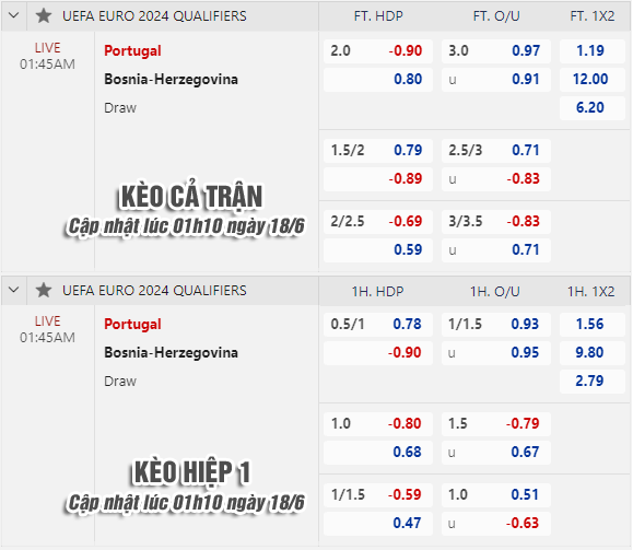 * Chốt kèo trận Bồ Đào Nha vs Bosnia (01h45 ngày 18/6)