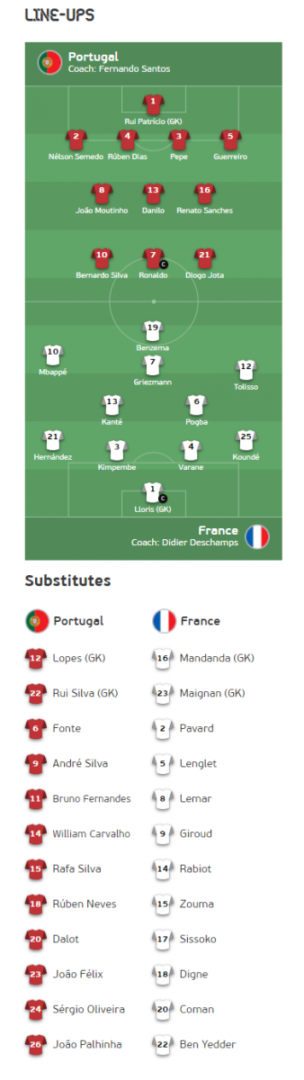 - Bồ Đào Nha (4-3-3): Patricio - Semedo, Dias, Pepe, Guerreiro - Pereira, Sanches, Fernandes - B.Silva, Ronaldo, Jota