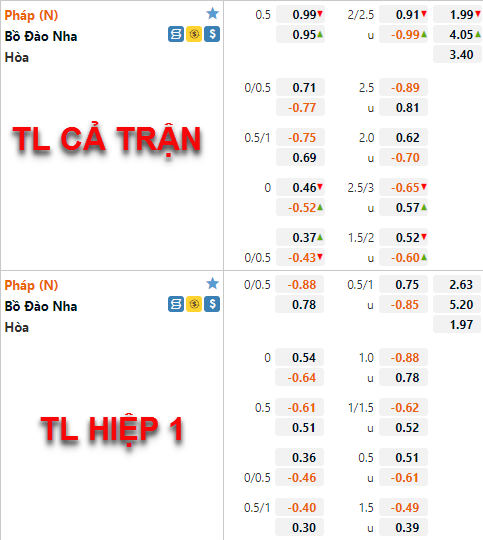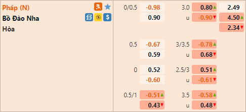 Tỷ lệ chấp của ĐT Pháp có xu hướng tăng điểm thời gian vừa qua. Hiện tại tỷ lệ chấp của Pháp đã được đẩy lên mức 1/2 thay cho mức 1/4 ở lần chúng tôi cập nhật trước đây. Bên phía tỷ lệ tài xỉu mốc 2 1/4 vẫn được duy trì là mốc chính của trận đấu nhưng điểm ăn của cửa tài đã được điều chính giảm tương đối nhiều.