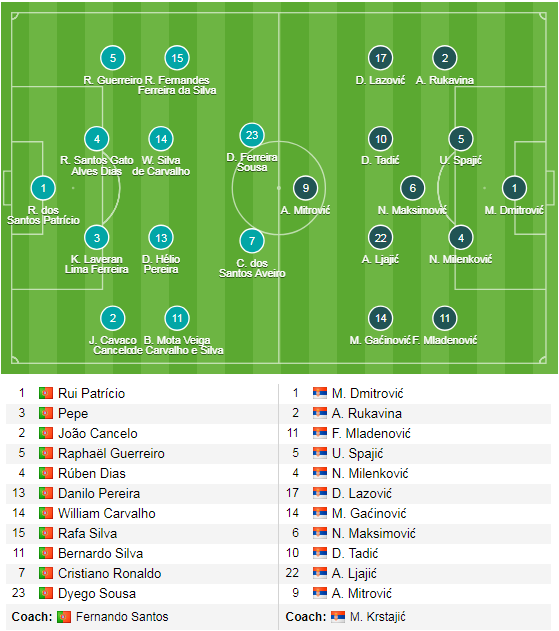 HLV Fernando Santos đã có một số sự thay đổi trong đội hình ra sân ở trận này so với trận gặp Ukraine cách đây ít ngày, ngoài Cristiano Ronaldo và Bernardo Silva là 2 cái tên đáng kỳ vọng nhất trên hàng công thì những nhân tố còn lại vẫn chưa thực sự tạo được niềm tin. Trong khi đó, chào đón sự trở lại của Mitrovic và Tadic trong đội hình ra sân, kèm theo kết quả thi đấu ấn tượng trong thời gian gần đây, Serbia cũng tạo được niềm tin không nhỏ ở cuộc đụng độ tới đây.