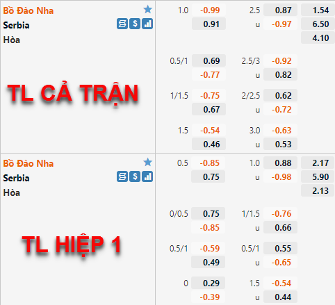Thay đổi trên sàn giao dịch châu Á đang đem lại dấu hiệu tốt cho lựa chọn cửa tài trận đấu này. Điều này hợp lý khi đội khách cần 1 chiến thắng trận này để giành ngôi đầu bảng và được dự đoán chủ động tân công ngay từ đầu, nhưng theo chúng tôi Serbia với lực lượng kém hơn đối thủ sẽ không mạo hiểm tân công ngay từ đầu, ở phía bên kia Bồ Đào Nha chỉ cần 1 kết quả hoà và lựa chọn tốt nhất của đội chủ nhà thi đấu thận trọng và chờ đợi sơ hở từ phía đối phương.