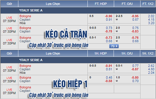 * Chốt kèo trận Bologna vs Cagliari (18h30)