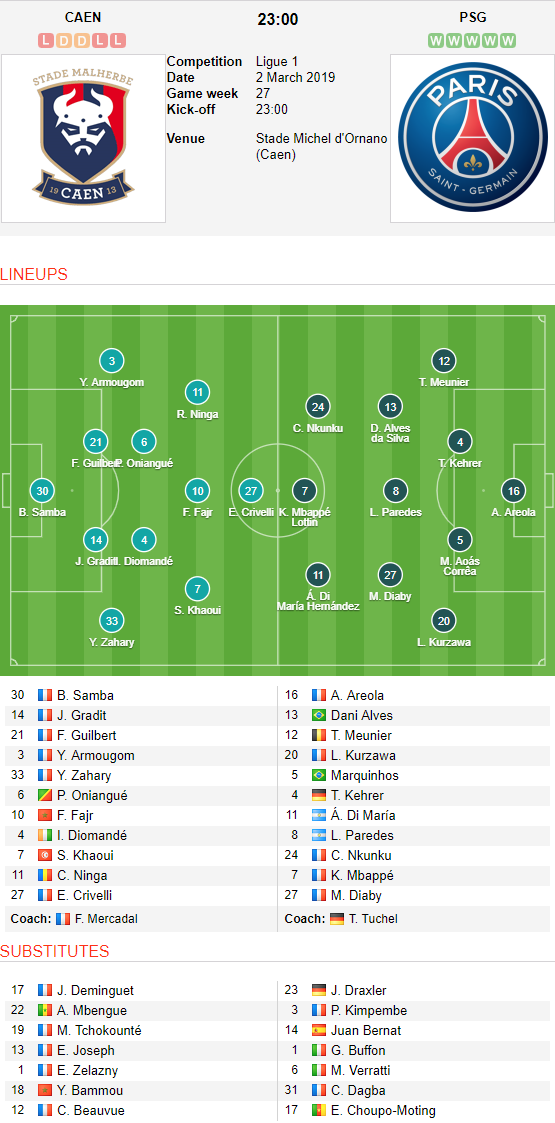 + Caen vs PSG (Vòng 27 giải VĐQG Pháp, Ligue 1)