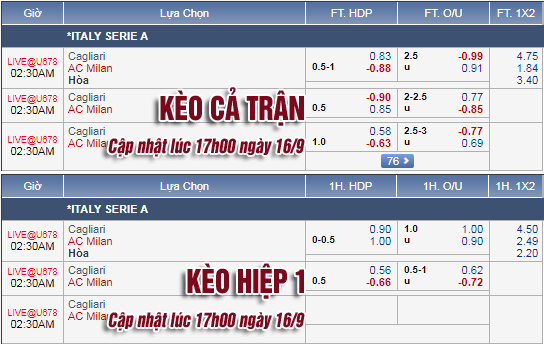 Mức kèo chính của trận đấu này đã hạ từ 3/4 xuống chỉ còn 1/2, phần nào cho thấy AC Milan không nhận được nhiều sự tin tưởng trong chuyến hành quân tới sân Sardegna Arena của Cagliari ngày hôm nay. Xét trên lý thuyết, đội bóng của HLV Gattuso vẫn rất mạnh với những cái tên nổi bật như Higuain, Suso, Calhanoglu... nhưng trên thực tế họ không đạt được những kết quả như mong muốn (thắng 1, thua 1 trận đầu tiên).