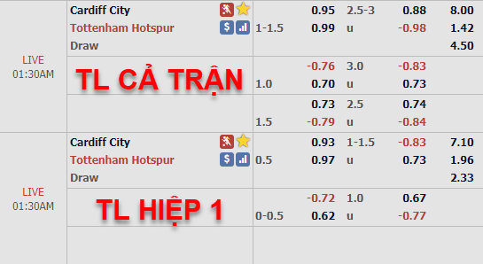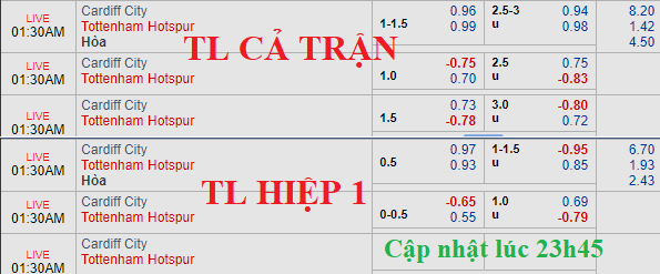 So với phiên khớp lệnh lúc 11h00 trưa ngày 01/01 thì tỷ lệ chính không có biến động nhiều, Tottenham vẫn chấp 1 1/4 với điểm ăn tương đối cân bằng cho 2 cửa. Trong khi đó, mốc tài xỉu 2 3/4 cũng được giữ nguyên và lợi nhuận bỏ vào cửa tài có gia tăng từ 0.88 lên thành 0.94. Trước đối thủ yếu như Cardiff mà Tottenham không có sự bứt phá trên sàn châu Á thì rõ ràng có lý do để nghi ngờ vào họ.