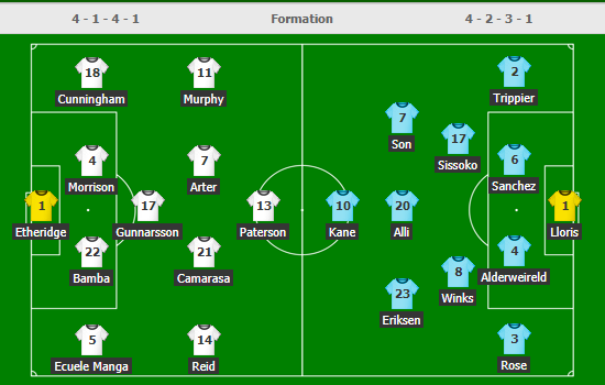 Tottenham (4-2-3-1): Lloris; Alderweireld, Davies, Aurier, Foyth; Winks, Sissoko; Alli, Eriksen, Son Heung-min; Kane.