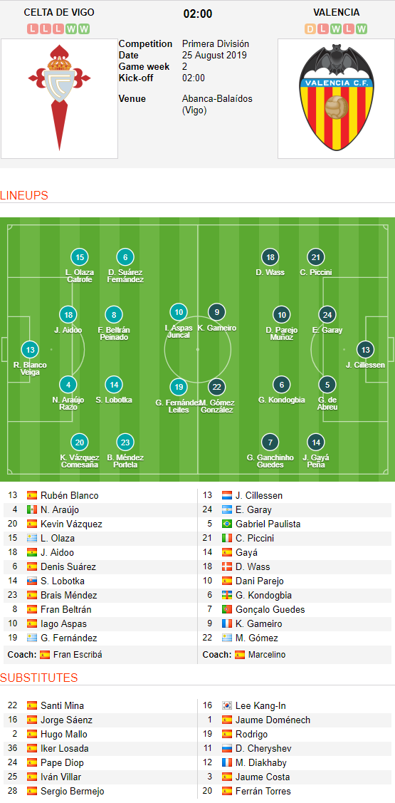 AEGoal.net chốt kèo trực tiếp trận Celta Vigo vs Valencia diễn ra lúc 02h00 ngày 25/8 sau khi dựa trên tính toán, chuyển động về kèo châu Á và đội hình ra sân của 2 đội.