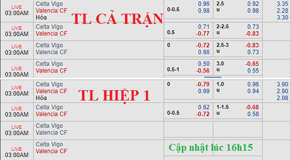Valencia vẫn được nhà cái đánh giá ở cửa trên với tỷ lệ chấp 1/4, điểm ăn của đội khách có giảm đôi chút so với thời điểm chiều qua. Biến động của thị trường cho thấy giới đầu tư có phần tin tưởng vào chiến thắng của Valencia hơn.