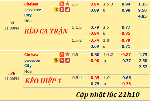 AEGoal.net chốt kèo trực tiếp trận Chelsea vs Leicester City diễn ra lúc 22h00 ngày 22/12 sau khi dựa trên tính toán, chuyển động về kèo châu Á và đội hình ra sân của 2 đội.