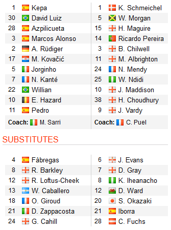 Morata chưa có thể lực tốt nhất đã không có suất đá chính. Giroud, Hazard, Pedro được bố trí chơi cao nhất trên hàng công với sơ đồ 4-3-3 giàu sức tấn công. Chelsea rõ ràng đã chơi bài ngửa với ý đồ tấn công tổng lực khi tiếp đối thủ vừa tầm như Leicester City.