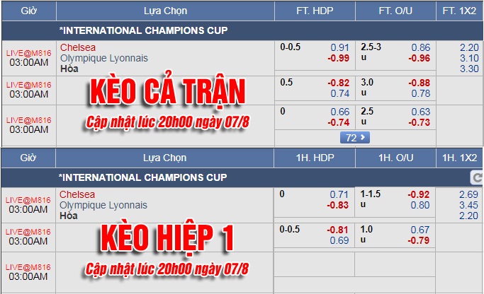 Tỷ lệ của trận cầu này biến động khá bất thường. Ban đầu khi mở kèo (ngày 2/8) Chelsea chấp hòa, sau đó đến ngày 5/8 còn 1/4 và đến rạng sáng ngày 6/8 thì The Blues chỉ được xếp ngang với Lyon. Dẫu vậy, định mức này chỉ tồn tại thời gian ngắn và lên mốc Chelsea chấp 1/4 rồi duy trì đến thời điểm hiện tại.