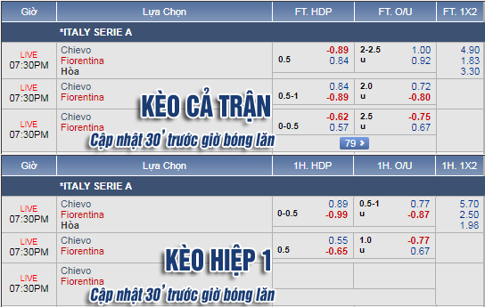 Những diễn biến mới nhất trên sàn giao dịch châu Á đang cho thấy những bất lợi với Chievo khi có những thời điểm mức chấp -1/2 của Fiorentina đã tăng lên thành -3/4 và hiện tại dù đã trở về mốc -1/2 thế nhưng điểm ăn ở mã này đang khá thấp. Trong khi đó, mốc tổng bàn thắng vẫn được giữ nguyên ở mức 2 1/4 cùng điểm ăn đã hạ đáng kể ở cửa Xỉu cũng đang cho thấy khả năng cởi mở của trận đấu không được đánh giá cao.