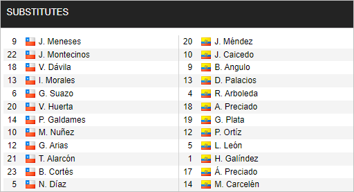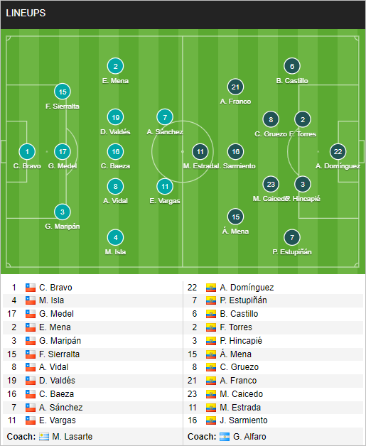Chile (3-5-2): Claudio Bravo (GK); Valber Huerta, Guillermo Maripan, Francisco Sierralta; Eugenio Mena, Claudio Baeza, Erick Pulgar, Diego Contreras, Marcelino Ezpinoza; Eduardo Vargas, Alexis Sanchez