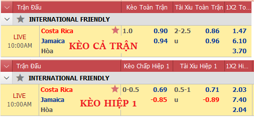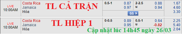 Costa Rica tăng điểm chóng mặt so với thời điểm đầu phiên. Đội chủ nhà kéo từ tỷ lệ chính chấp 3/4 lên kèo chấp 1 hòa ở thời điểm hiện tại. Điều đáng nói, trong khi cửa trên tăng giá rất cao thì tổng bàn thắng cả trận lại không nhiều biến động. Tỷ lệ cho chỉ số cởi mở vẫn dừng lại ở mức 2 1/4 cùng lợi điểm cân bằng giữa các lựa chọn đối lập.