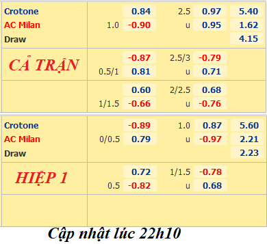 AEGoal.net chốt kèo bóng đá trực tiếp trận Crotone vs AC Milan diễn ra lúc 23h00 ngày 27/09 trong khuôn khổ giải VĐQG Italia sau khi dựa trên tính toán, chuyển động về kèo châu Á và đội hình ra sân của 2 đội.