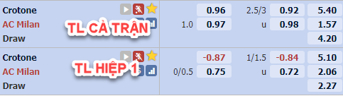 Kèo chấp 1 hòa của AC Milan đã bị đẩy xuống điểm bỏ khá sâu. Cùng với đó là kèo Tài-Xỉu biến động từ 2 3/4 xuống còn 2 1/2. Đây là điểm mấu chốt để giới chuyên gia dự đoán nhiều vào kịch bản khan hiếm bàn thắng. Bởi thực tế phía chủ nhà chỉ là tân binh.