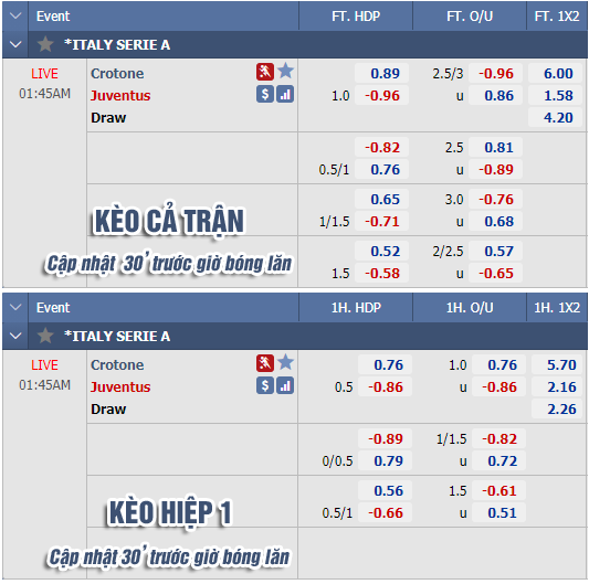 * Chốt kèo trận Crotone vs Juventus (01h45 ngày 18/10)