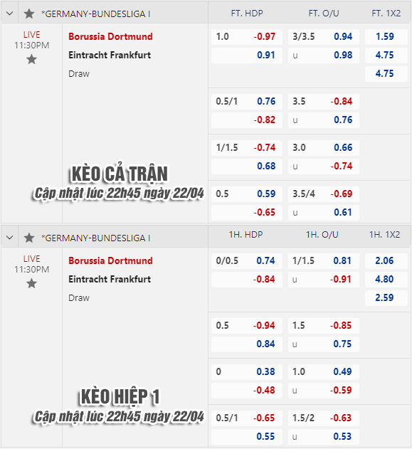 * Chốt kèo trận Dortmund vs Eintracht Frankfurt (23h30 ngày 22/4)