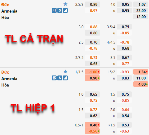 Tỷ lệ của đội chủ nhà Đức có xu hướng tăng điểm thời gian vừa qua. Hiện tại mức chấp chính của ĐT Đức đã được đẩy lên mức 2 3/4 so với mức 2 1/2 ở lần chúng tôi cập nhật trước đây. Tỷ lệ tài xỉu cũng có diễn biến tương tự khi mốc 3 3/4 trước đây đã được thay thể bằng mức 4 hoà ở thời điểm hiện tại.