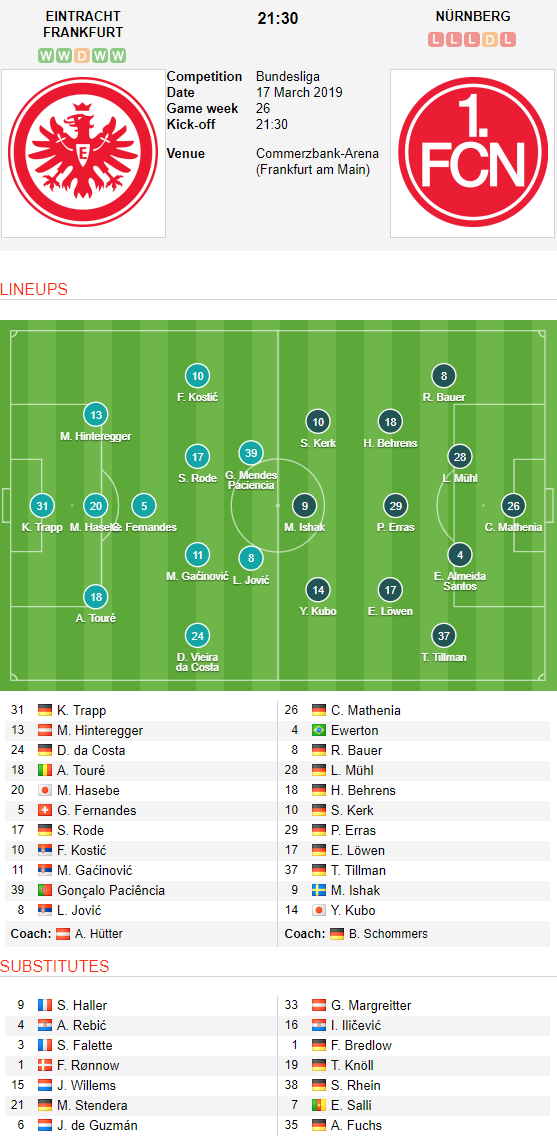 - Frankfurt: Vắng Lucas Torro (chấn thương); Khả năng ra sân của Timothy Chandler, David Abraham và Ante Rebic còn bỏ ngỏ.