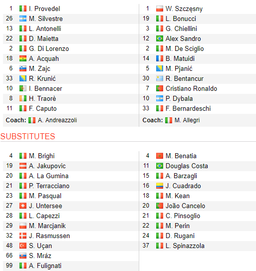 Juventus vẫn sử dụng đội hình mạnh nhất của mình. Sự có mặt của Ronaldo, Dybala cho thấy HLV Allegri muốn chắc chắn một chiến thắng cho đội nhà. Không có nhiều có hội cho Empoli có thể tạo nên bất ngờ ở vòng đấu này.