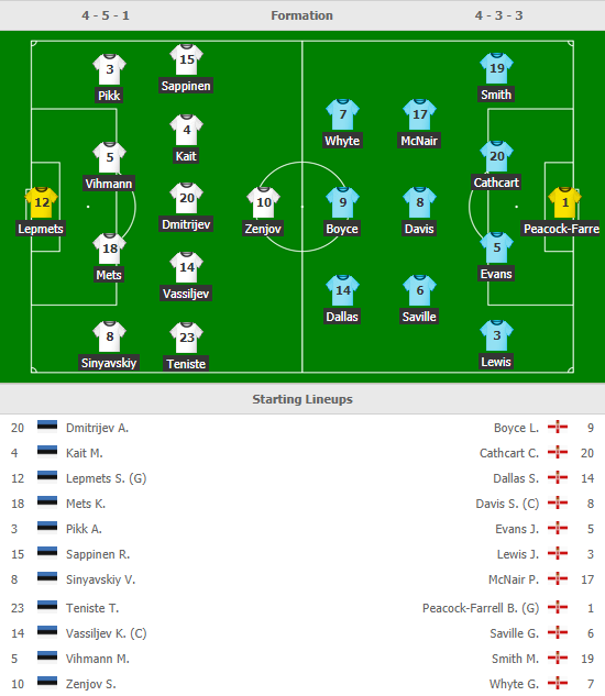 Estonia (5-4-1): Mihkel Aksalu (TM), Gert Kams, Marten Kuusk, Joonas Tamm, Karol Mets, Artur Pikk, Sander Puri, Mattias Kait, Konstantin Vassiljev, Henrik Ojamaa, Sergej Zenjov.