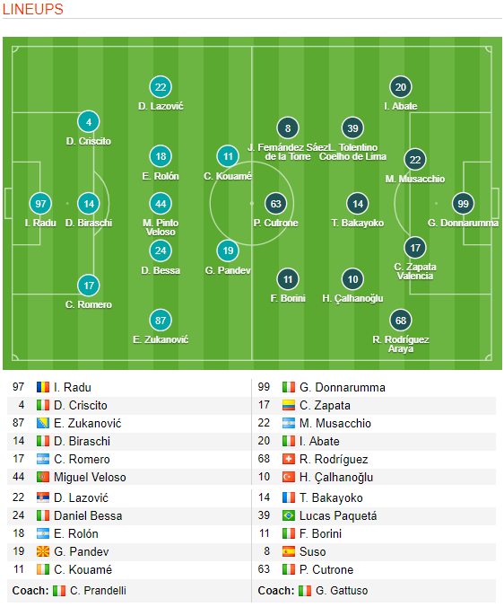 - AC Milan: Vắng Ivan Strinic, Mattia Caldara, Lucas Biglia, Giacomo Bonaventura (chấn thương), Alessio Romagnoli, Davide Calabria và Franck Kessie (treo giò).
