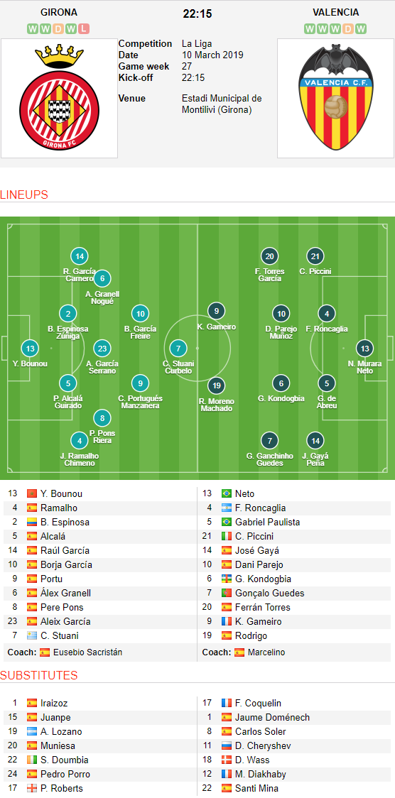 AEGoal.net chốt kèo trực tiếp trận Girona vs Valencia diễn ra lúc 22h15 ngày 10/3 sau khi dựa trên tính toán, chuyển động về kèo châu Á và đội hình ra sân của 2 đội.