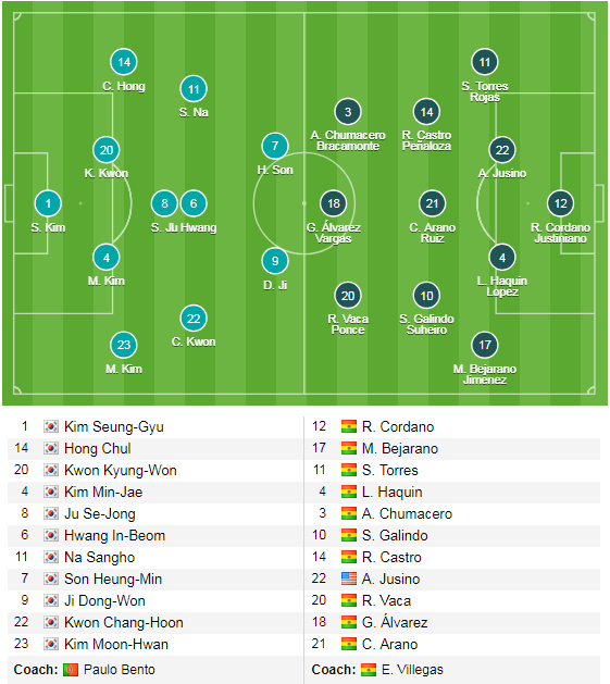 Hàn Quốc (4-2-3-1): Kim Seung-Gyu, Kim Young-Kwon, Kim Minjae, Kim Jin-Su, Lee Yong, Heung-Min Son, Jung Woo-Young, Hwang In-Beom, Hwang Ui-Jo, Lee Chung-Yong,Ju Se-Jong.