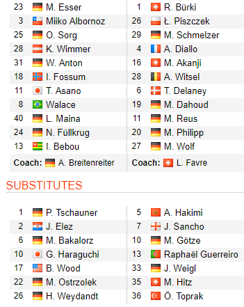 Dortmund (4-3-3): Burki - Piszczek, Akanji, Diallo, Schmelzer - Dahoud, Witsel, Delaney - Pulisic, Philipp, Reus.