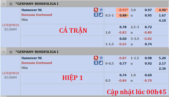 Dortmund đã chứng kiến đà lào dốc thảm hại ở phiên giao dịch hôm nay. Đội bóng vùng Ruhr khởi đầu với tỷ lệ chấp 1 hòa nhưng đến thời điểm bóng chuẩn bị lăn đã bị điều chỉnh xuống kèo chính chấp 3/4. Đây rõ ràng là tín hiệu đáng lo lắng cho những ai ưa thích lựa chọn cửa trên.