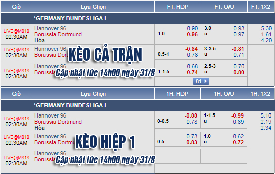 CHỐT KÈO trực tiếp trận Hannover vs Dortmund, 01h30 ngày 01/9: Cửa trên sụt giảm mạnh