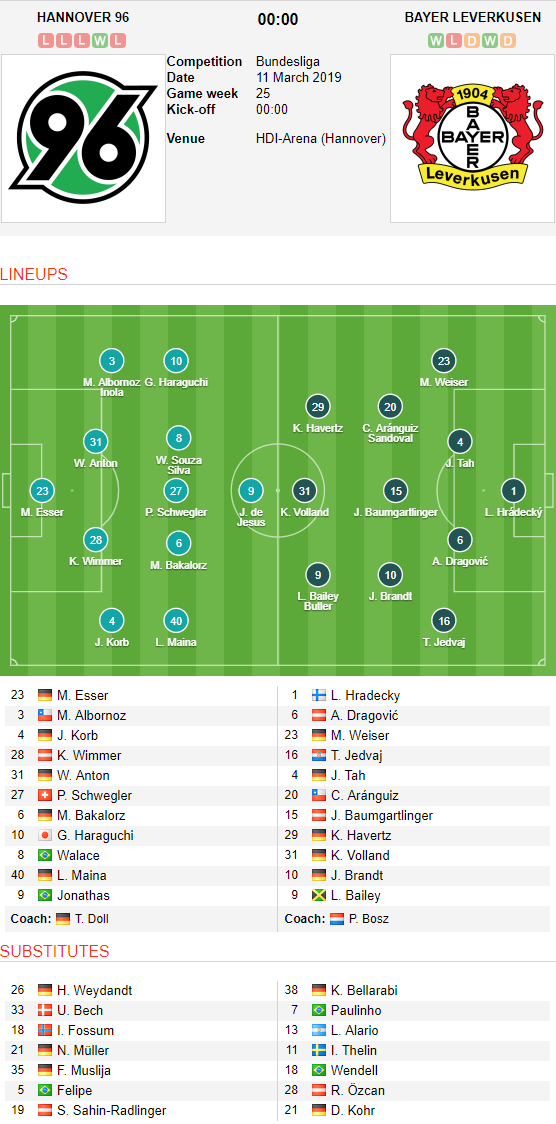 * Trước đây 2 đội từng 44 lần gặp nhau, Hannover thắng 7 còn Leverkusen thắng 24 trận.