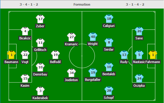 Cả 2 đội đều xác định chơi tấn công khi chỉ bố trí sơ đồ 3 trung vệ. Các chân sút tốt nhất của 2 bên như Kramaric hay Burgstaller cũng đều xuất hiện ngay từ đầu. Các trận vừa qua của Hoffenheim đều diễn ra tưng bừng khi họ chơi cực kỳ cởi mở. Kịch bản đó hứa hẹn sẽ lặp lại trong cuộc chiến này khi Schalke cũng có xu hướng chơi đôi công với đội hình ra sân như dưới đây.