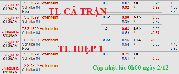 Hoffenheim không còn giữ được mức chấp 3/4 như ở phiên giao dịch lúc 11h00 sáng ngày 1/12, trước giờ bóng lăn 30 phút, tỷ lệ chính chỉ còn ở mức chủ chấp hòa. Trong khi đó, mốc tài xỉu vẫn giữ nguyên ở mức 3 hòa và điểm ăn không xê dịch quá nhiều.