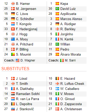 Chelsea (4-3-3): Caballero; Azpilicueta, Rudiger, David Luiz, Alonso; Jorginho, Barkley, Fabregas; Willian, Morata, Pedro.