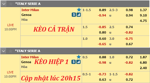 AEGoal.net chốt kèo trực tiếp trận Inter Milan vs Genoa, sau khi dựa trên tính toán, chuyển động về kèo châu Á và đội hình ra sân của 2 đội.