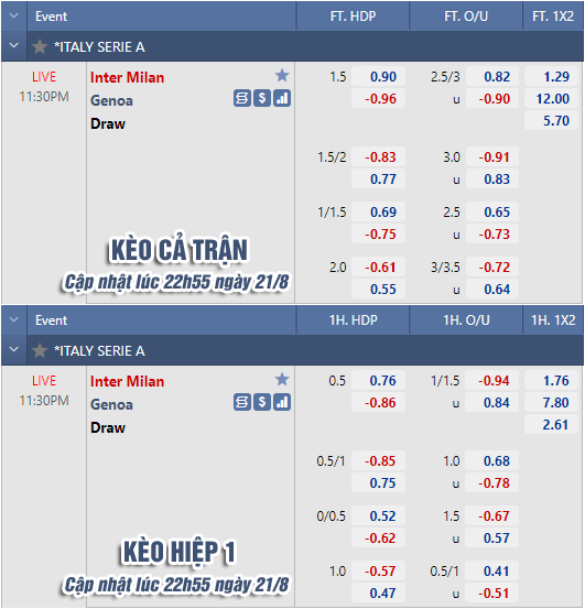 AEGoal chốt kèo bóng đá trực tiếp trận Inter Milan vs Genoa diễn ra lúc 23h30 ngày 21/8 trong khuôn khổ giải VĐQG Italia sau khi dựa trên tính toán, chuyển động về kèo châu Á và đội hình ra sân của 2 đội.