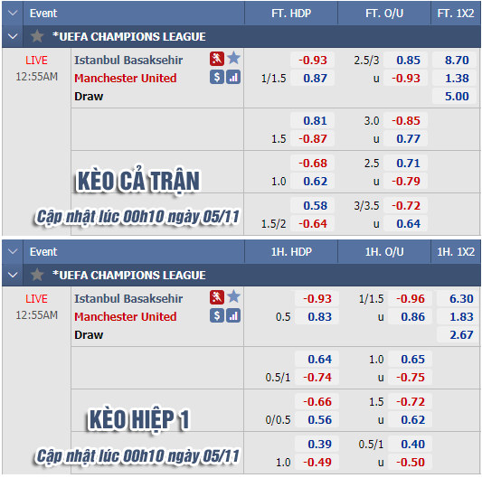 * Chốt kèo trận Istanbul BB vs Man Utd (00h55 ngày 5/11)