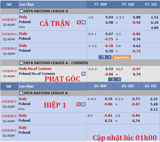 AEGoal.net chốt kèo trực tiếp trận Italia vs Ba Lan sau khi dựa trên tính toán, chuyển động về kèo châu Á và đội hình ra sân của 2 đội.