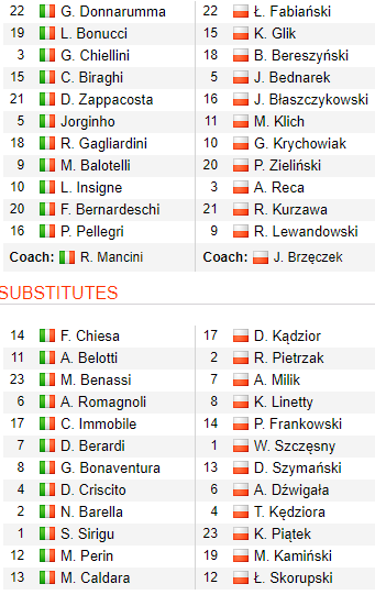 - Hậu vệ: Pietrzak, Reca, Kamiński, Bednarek, Rybus, Kędziora, Glik, Bereszyński, Dźwigała.