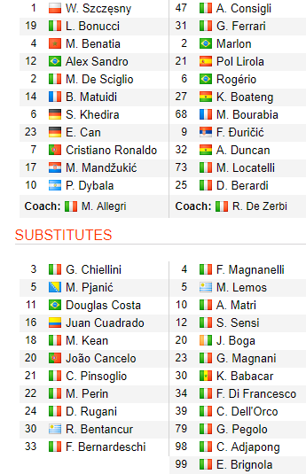 Juventus: Szczesny; Cancelo, Bonucci, Chiellini, Alex Sandro; Khedira, Pjanic, Matuidi; Bernardeschi, Mandzukic, Cristiano Ronaldo
