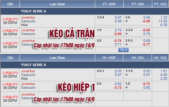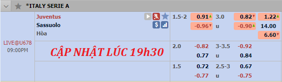 Ronaldo, Mandzukic, Emre Can, Dybala, Khedira đều đá chính, Juventus tung ra đội hình rất mạnh với chất lượng chuyên môn vượt trội so với Sassuolo. Tuy nhiên, nhà ĐKVĐ Serie A vẫn không có dịch chuyển đáng chú ý theo chiều hướng tích cực trên sàn châu Á. Tỷ lệ chính vẫn giữ ở mức chấp 1 3/4 cùng lợi nhuận cân bằng giữa các lựa chọn đối lập.