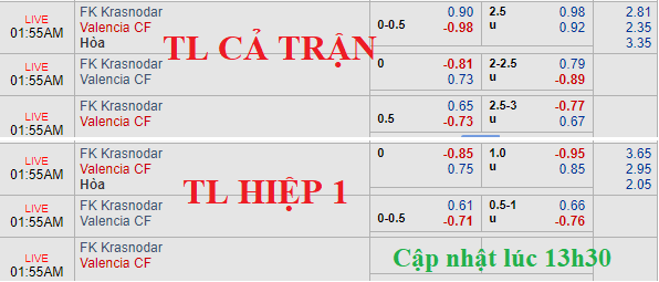 CHỐT KÈO TRỰC TIẾP trận Krasnodar vs Valencia (0h55)