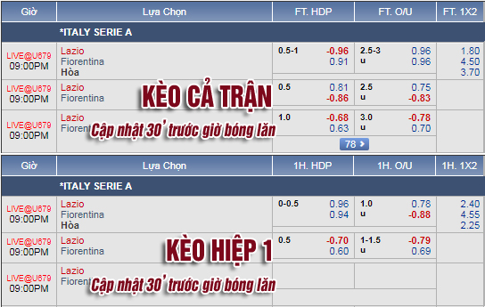 * Chốt kèo trận Lazio vs Fiorentina (20h00)