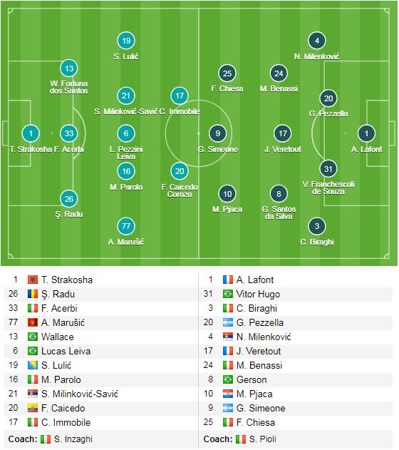 Ở trận này, Lazio đã tung ra những con bài tốt nhất của mình, đặc biệt trên hàng công là những Immobile và Caicedo, trong khi bên phía Fiorentina là đội hình 4-3-3 quen thuộc với bộ 3 giàu sức tấn công Chiesa-Simeone-Pjaca. Với những diễn biến như hiện tại, có thể hy vọng vào 1 cuộc đối đầu cởi mở với nhiều bàn thắng được ghi.