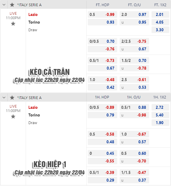* Chốt kèo trận Lazio vs Torino (23h00 ngày 22/4)