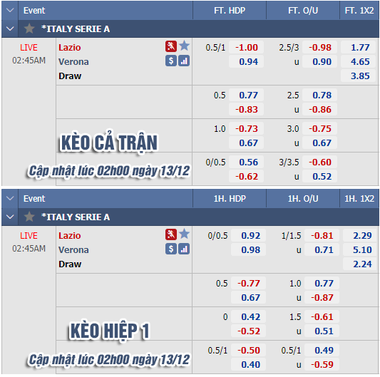 * Chốt kèo trận Lazio vs Verona (02h45 ngày 13/12)
